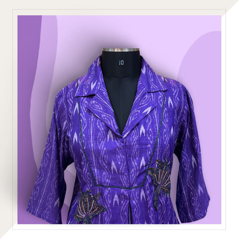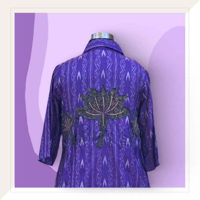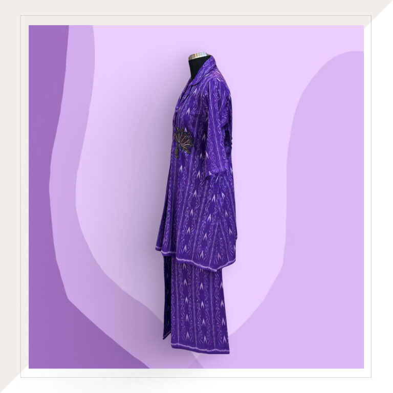An Odisha Ikat cord set in striking colours of purple and off white with a pop of stunning lotus patchwork. The style features a top and pants with the top embellished in green and mustard patchwork.