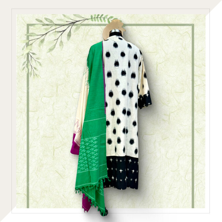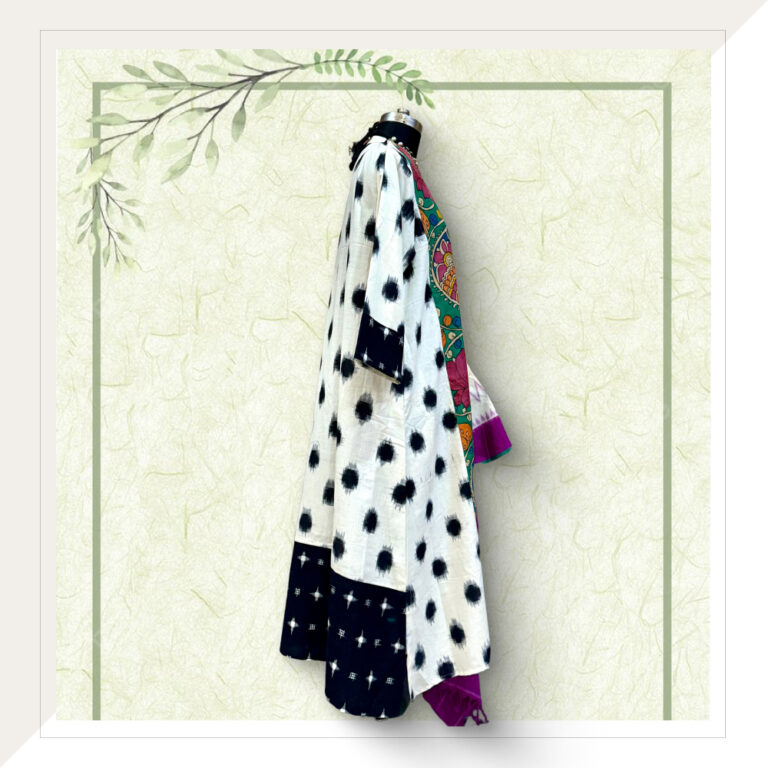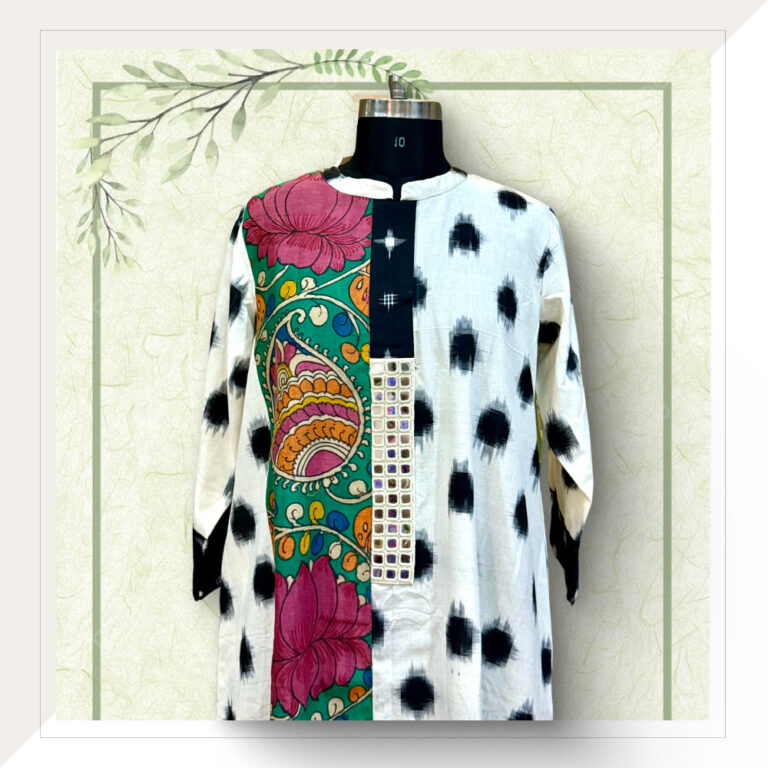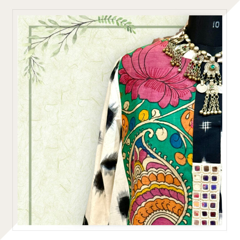 The Ikat fabric showcases small round patterns, while the colourful jade green and pink kalamkari patch in front adds an eye-catching touch.