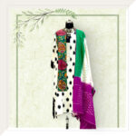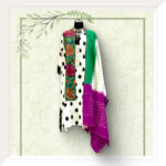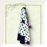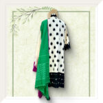 This stunning white and black double Ikat long dress features mirror work and Kalamkari blending traditional craftsmanship with modern elegance.
